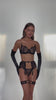 • Vierdelige set – beha + string + jarretelgordel + dijbanden